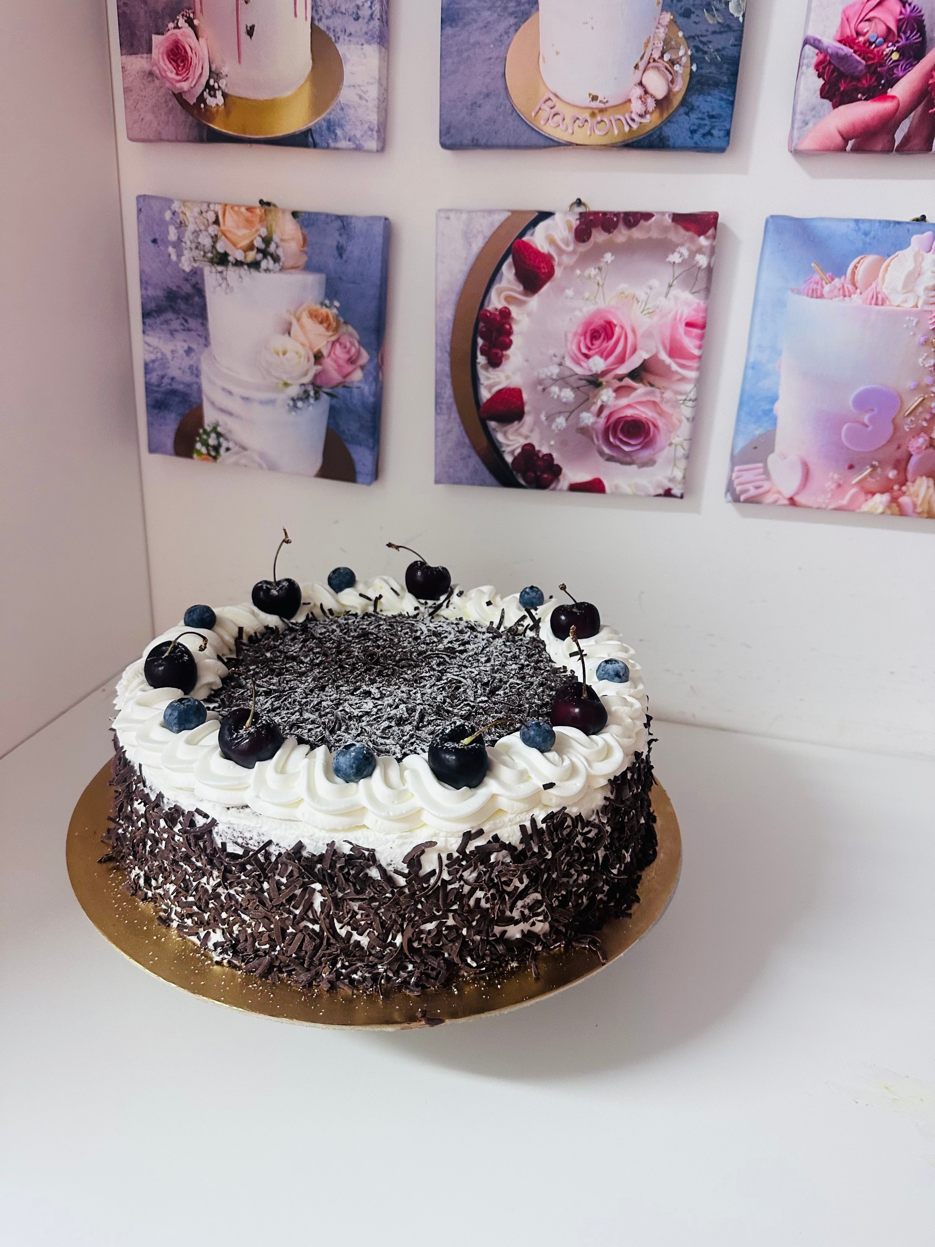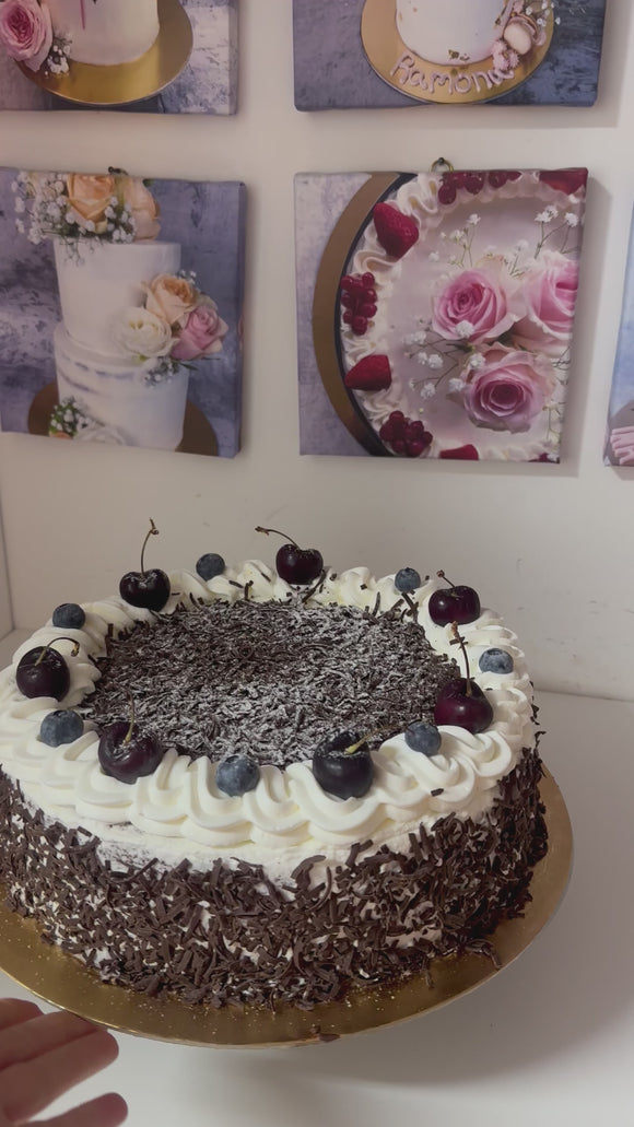 The decadence of our Black Forest Cake, a timeless classic that combines layers of moist chocolate sponge cake with indulgent whipped cream and a symphony of dark cherries. Each bite is a delightful contrast of rich, velvety chocolate and the tart sweetness of the cherries, creating a perfect balance of flavors.